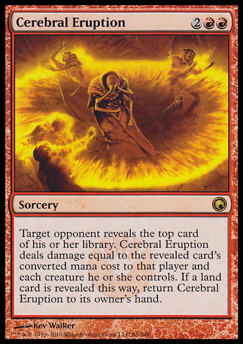 | Oracle Text | Target opponent reveals the top card of his or her library. Cerebral Eruption deals damage equal to the revealed card's converted mana cost to that player and each creature he or she controls. If a land card is revealed this way, return Cerebral Eruption to its owner's hand. | ||