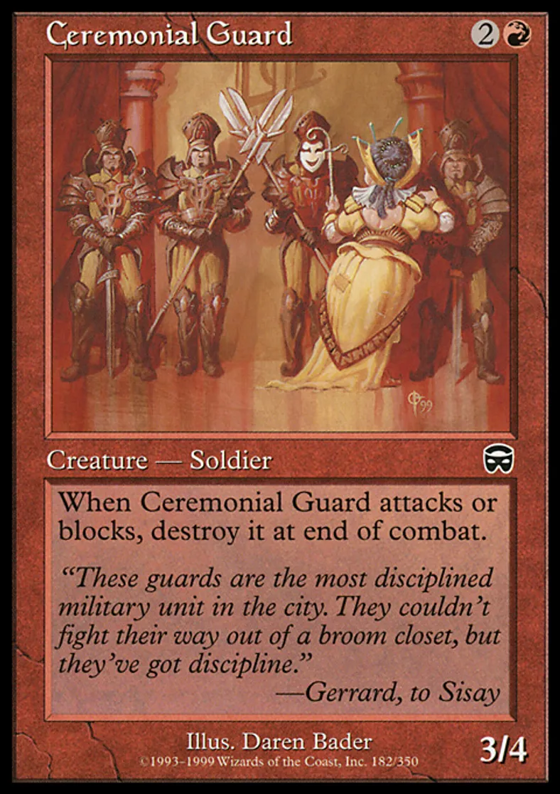 | Oracle Text | When Ceremonial Guard attacks or blocks, destroy it at end of combat. | ||