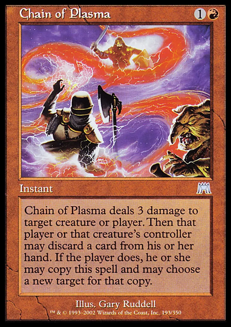 | Oracle Text | Chain of Plasma deals 3 damage to target creature or player. Then that player or that creature's controller may discard a card. If the player does, he or she may copy this spell and may choose a new target for that copy. | ||