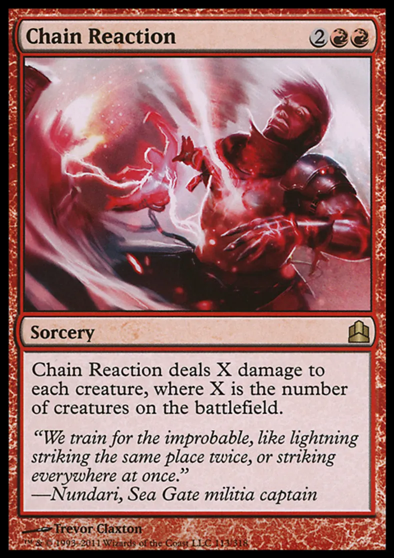 | Oracle Text | Chain Reaction deals X damage to each creature, where X is the number of creatures on the battlefield. | ||