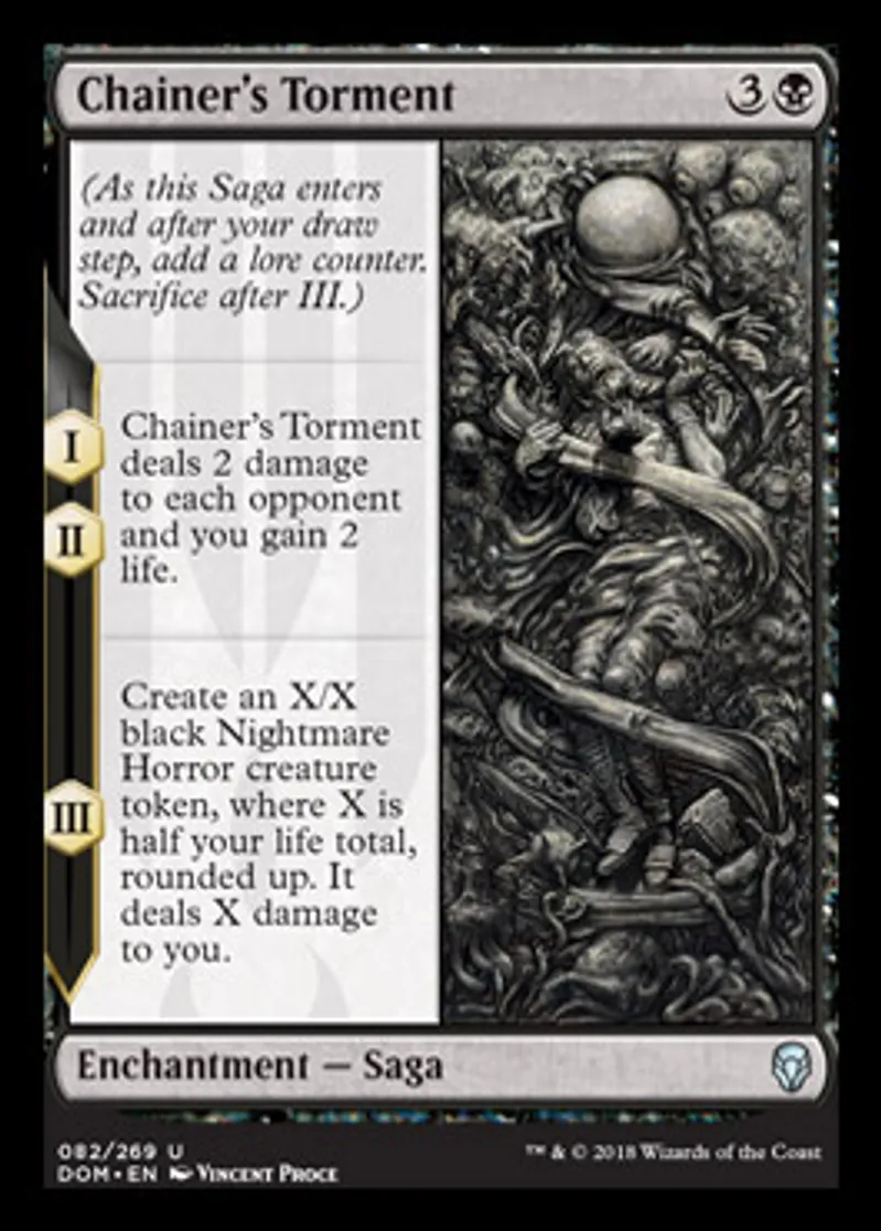 | Oracle Text | (As this Saga enters and after your draw step, add a lore counter. Sacrifice after III.) I, II — Chainer's Torment deals 2 damage to each opponent and you gain 2 life. III — Create an X/X black Nightmare Horror creature token, where X is half your life total, rounded up. It deals X damage to you. | ||
