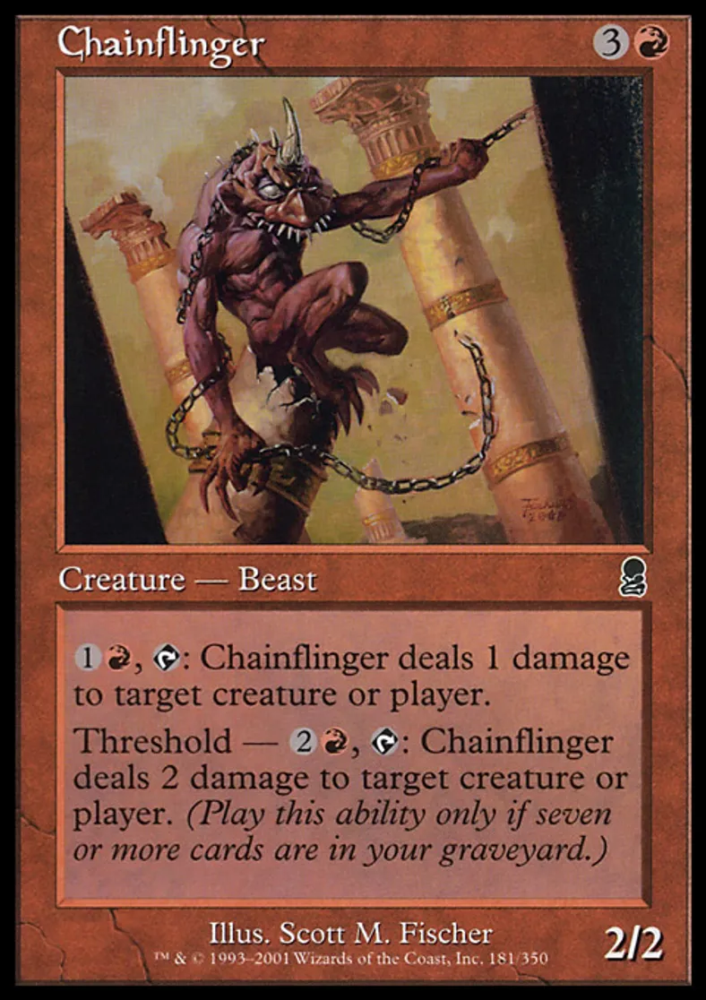| Oracle Text | {{1}}{{r}}, {{t}}: Chainflinger deals 1 damage to target creature or player. Threshold — {{2}}{{r}}, {{t}}: Chainflinger deals 2 damage to target creature or player. Activate this ability only if seven or more cards are in your graveyard. | ||