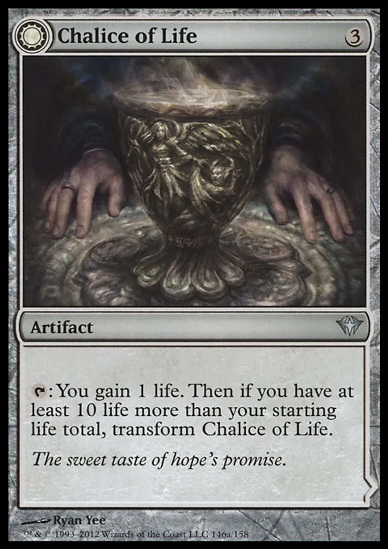 | Oracle Text | {{t}}: You gain 1 life. Then if you have at least 10 life more than your starting life total, transform Chalice of Life. | ||