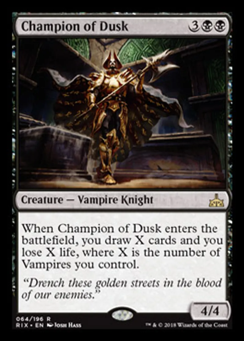 | Oracle Text | When Champion of Dusk enters the battlefield, you draw X cards and you lose X life, where X is the number of Vampires you control. | ||