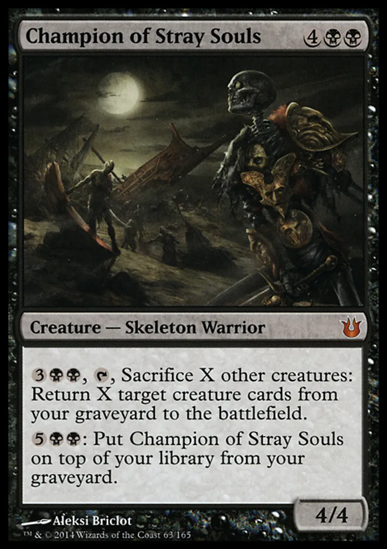 | Oracle Text | {{3}}{{b}}{{b}}, {{t}}, Sacrifice X other creatures: Return X target creature cards from your graveyard to the battlefield. {{5}}{{b}}{{b}}: Put Champion of Stray Souls on top of your library from your graveyard. | ||