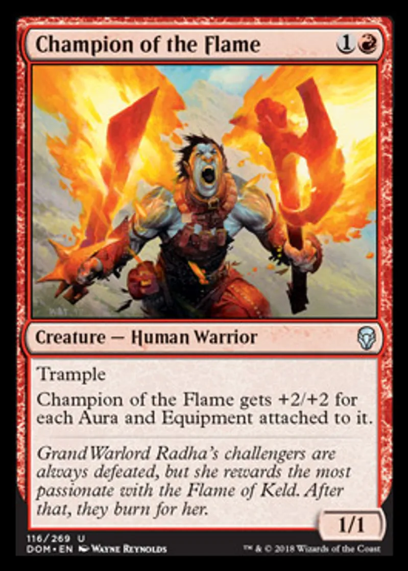 | Oracle Text | Trample Champion of the Flame gets +2/+2 for each Aura and Equipment attached to it. | ||