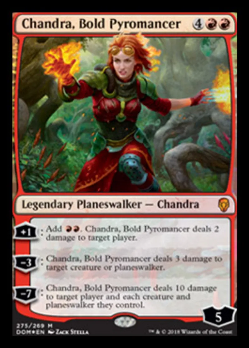 | Oracle Text | +1: Add {{r}}{{r}}. Chandra, Bold Pyromancer deals 2 damage to target player. −3: Chandra, Bold Pyromancer deals 3 damage to target creature or planeswalker. −7: Chandra, Bold Pyromancer deals 10 damage to target player and each creature and planeswalker they control. | ||