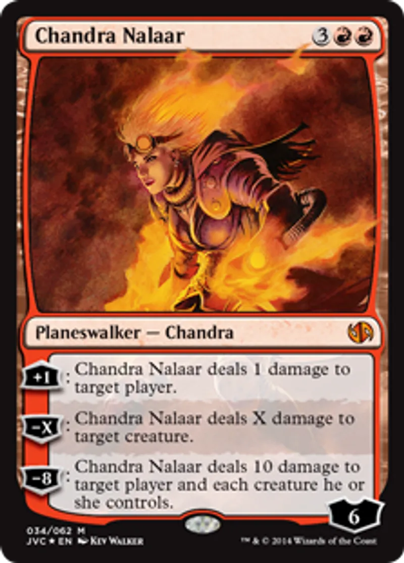 | Oracle Text | +1: Chandra Nalaar deals 1 damage to target player. −X: Chandra Nalaar deals X damage to target creature. −8: Chandra Nalaar deals 10 damage to target player and each creature he or she controls. | ||