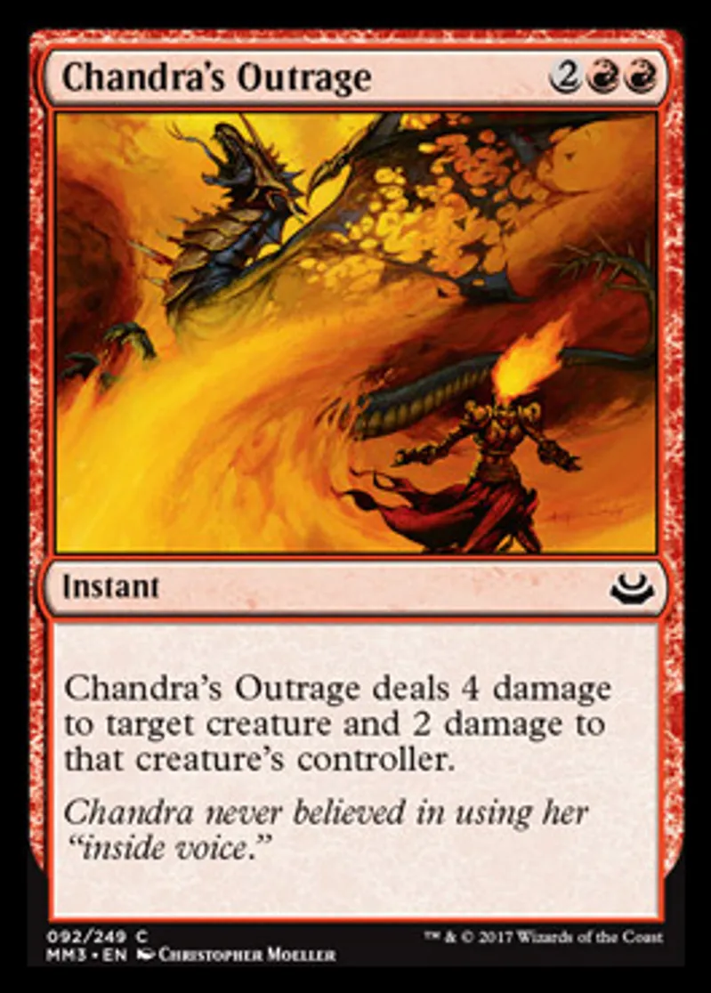 | Oracle Text | Chandra's Outrage deals 4 damage to target creature and 2 damage to that creature's controller. | ||