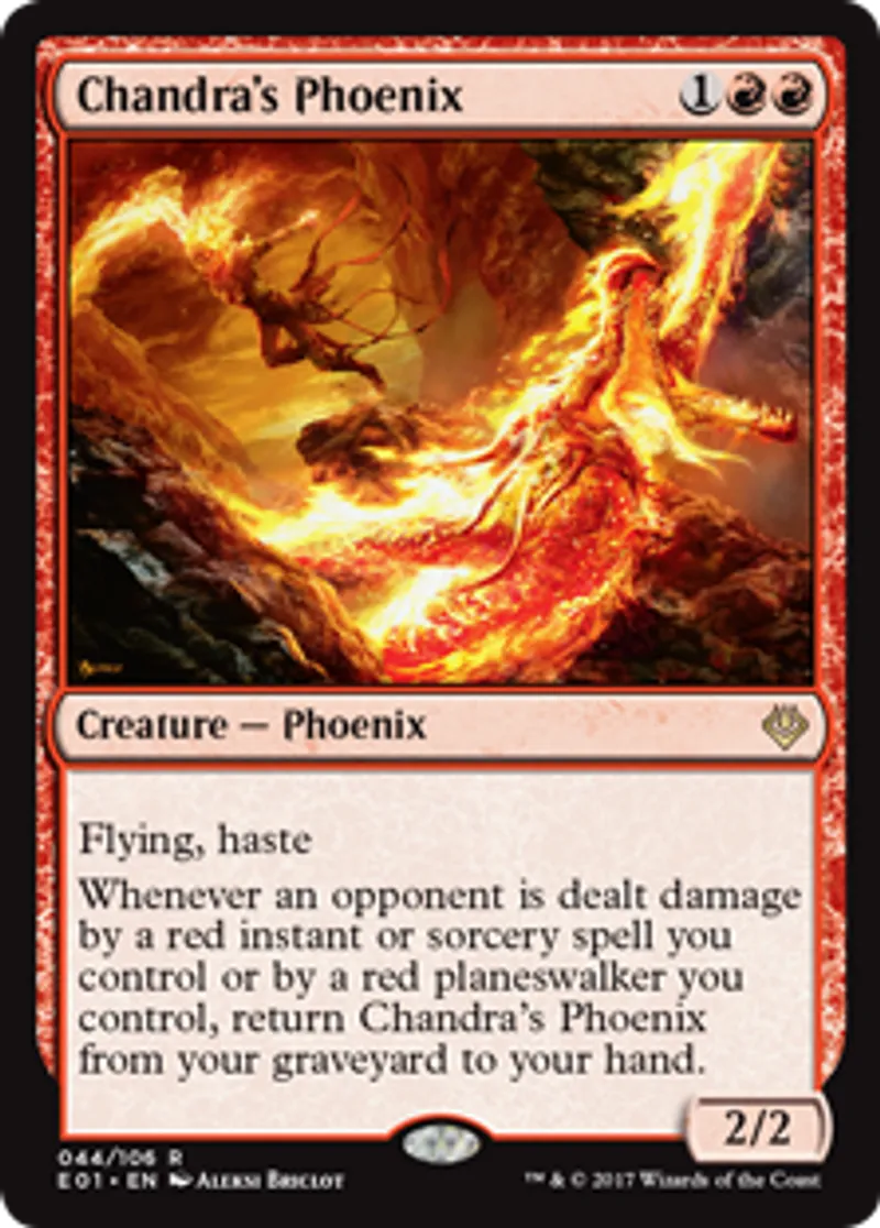 | Oracle Text | Flying Haste (This creature can attack and {{t}} as soon as it comes under your control.) Whenever an opponent is dealt damage by a red instant or sorcery spell you control or by a red planeswalker you control, return Chandra's Phoenix from your graveyard to your hand. | ||