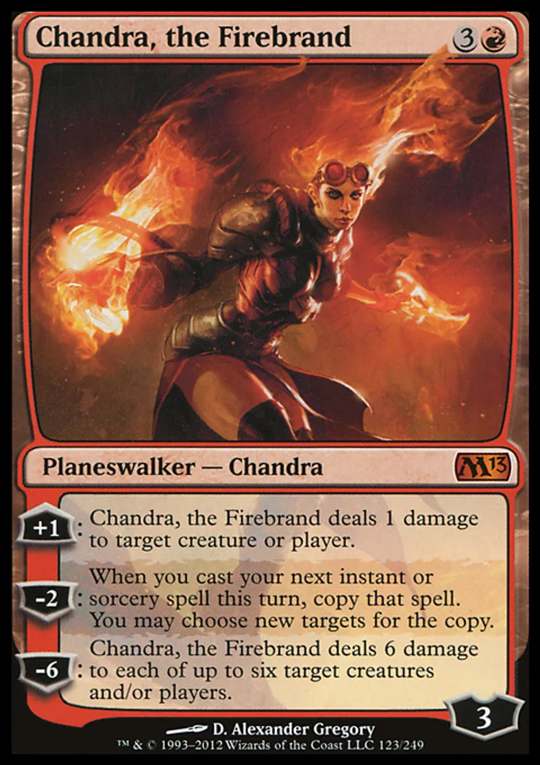 | Oracle Text | +1: Chandra, the Firebrand deals 1 damage to target creature or player. -2: When you cast your next instant or sorcery spell this turn, copy that spell. You may choose new targets for the copy. -6: Chandra, the Firebrand deals 6 damage to each of up to six target creatures and/or players. | ||