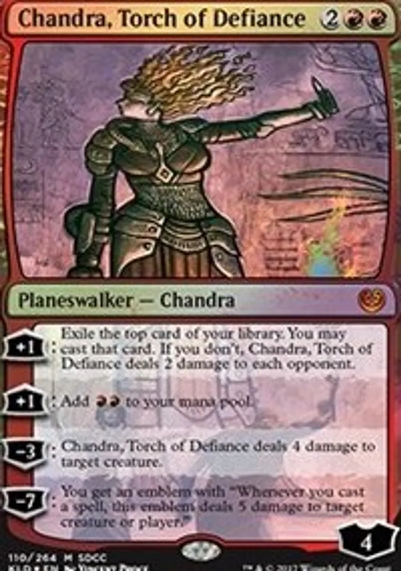 | Oracle Text | [+1]: Exile the top card of your library. You may cast that card. If you don't, Chandra, Torch of Defiance deals 2 damage to each opponent.
