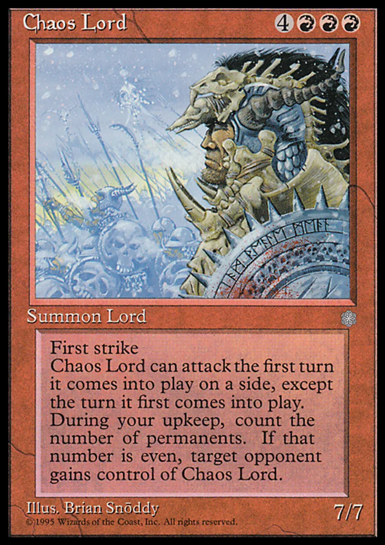 | Oracle Text | First strike At the beginning of your upkeep, target opponent gains control of Chaos Lord if the number of permanents is even. Chaos Lord can attack as though it had haste unless it entered the battlefield this turn. | ||