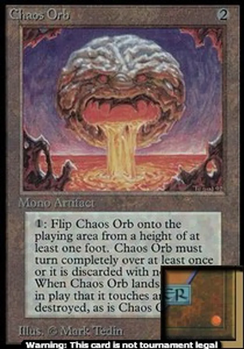 | Oracle Text | {{1}}, {{t}}: If Chaos Orb is on the battlefield, flip Chaos Orb onto the battlefield from a height of at least one foot. If Chaos Orb turns over completely at least once during the flip, destroy all permanents it touches. Then destroy Chaos Orb. | ||