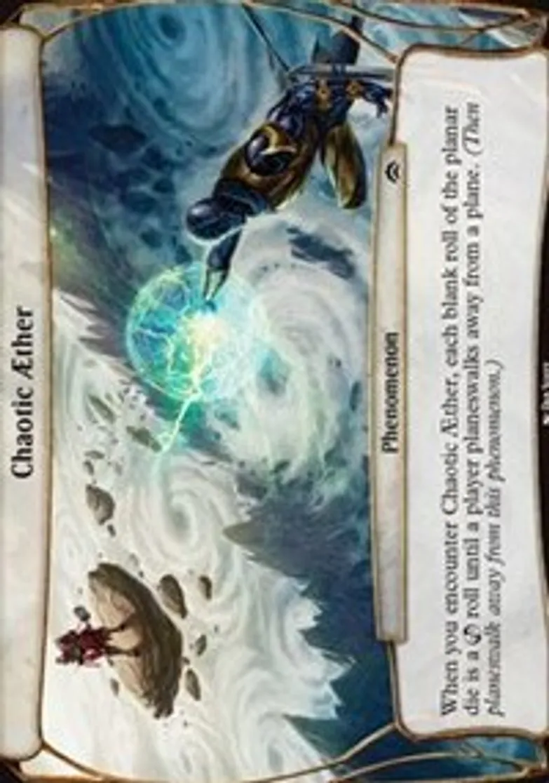 | Oracle Text | When you encounter Chaotic Aether, each blank roll of the planar die is a Chaos roll until a player planeswalks away from a plane. (Then planeswalk away from this phenomenon.) | ||