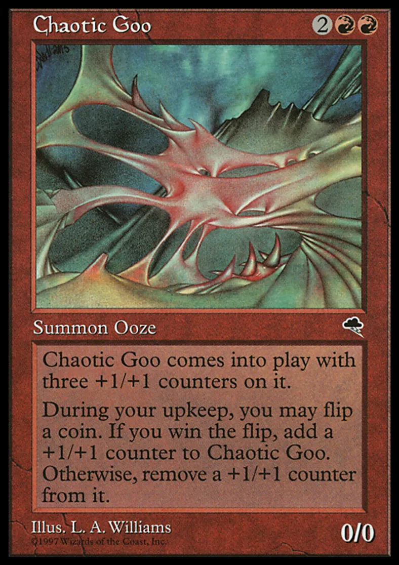 | Oracle Text | Chaotic Goo enters the battlefield with three +1/+1 counters on it. At the beginning of your upkeep, you may flip a coin. If you win the flip, put a +1/+1 counter on Chaotic Goo. If you lose the flip, remove a +1/+1 counter from Chaotic Goo. | ||
