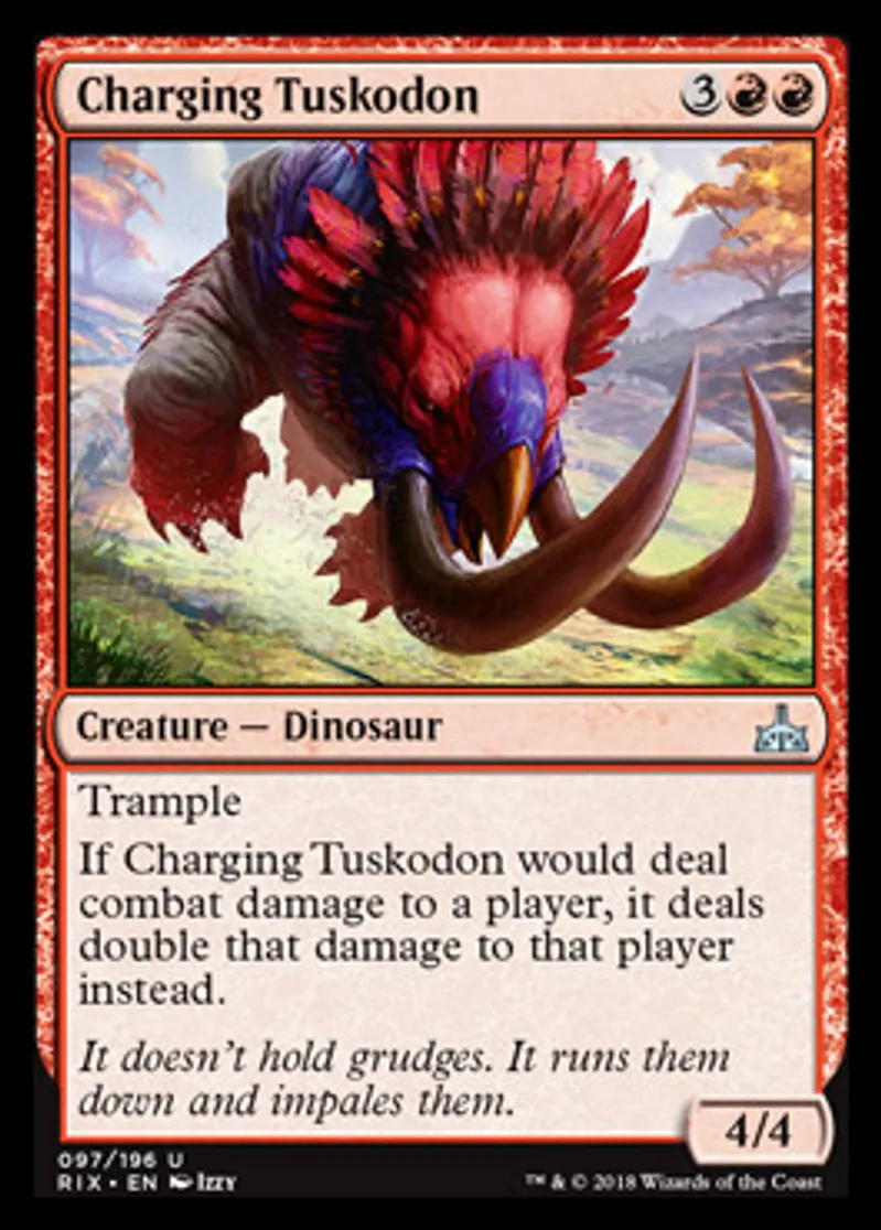 | Oracle Text | Trample If Charging Tuskodon would deal combat damage to a player, it deals double that damage to that player instead. | ||