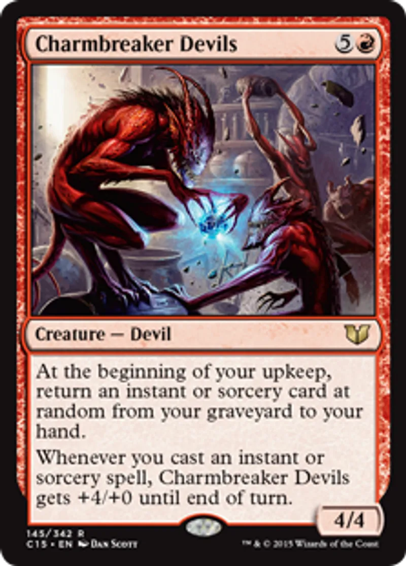 | Oracle Text | At the beginning of your upkeep, return an instant or sorcery card at random from your graveyard to your hand. Whenever you cast an instant or sorcery spell, Charmbreaker Devils gets +4/+0 until end of turn. | ||