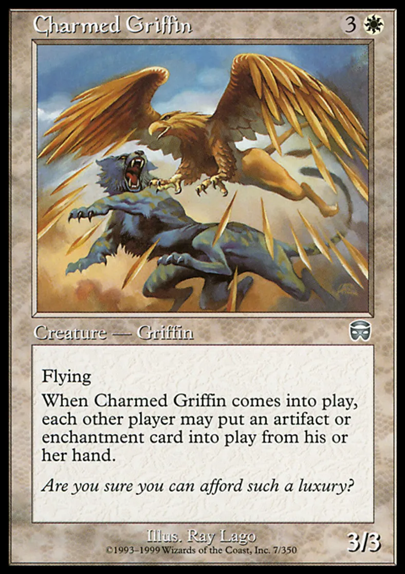 | Oracle Text | Flying When Charmed Griffin enters the battlefield, each other player may put an artifact or enchantment card onto the battlefield from his or her hand. | ||