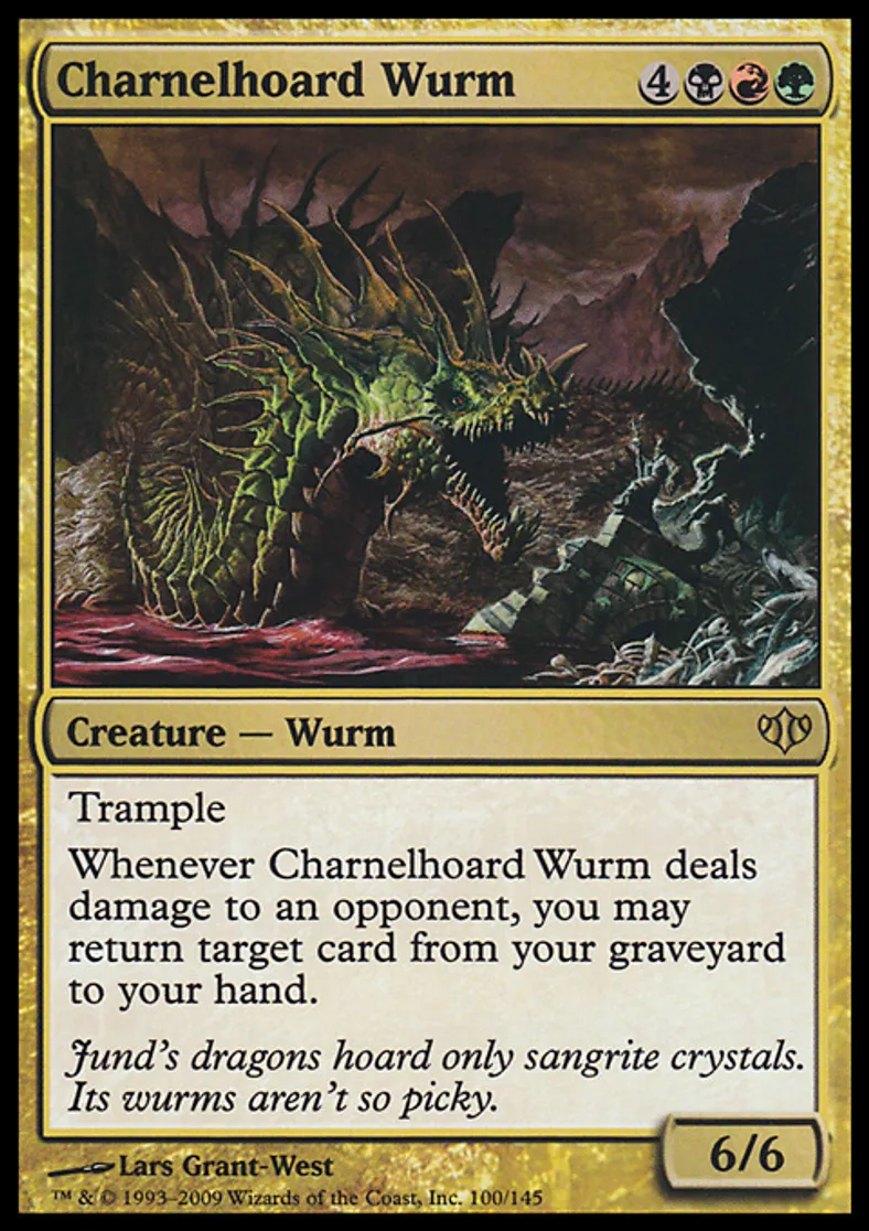| Oracle Text | Trample Whenever Charnelhoard Wurm deals damage to an opponent, you may return target card from your graveyard to your hand. | ||