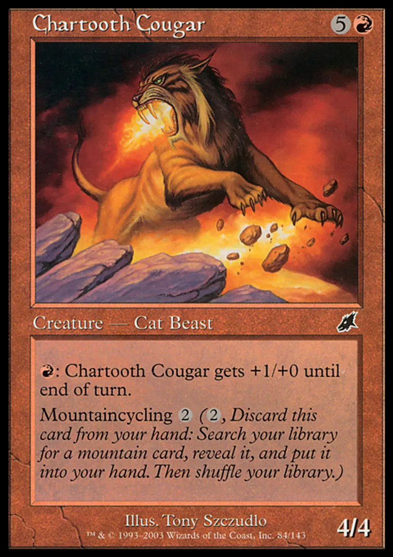 | Oracle Text | {{r}}: Chartooth Cougar gets +1/+0 until end of turn. Mountaincycling {{2}} ({{2}}, Discard this card: Search your library for a Mountain card, reveal it, and put it into your hand. Then shuffle your library.) | ||