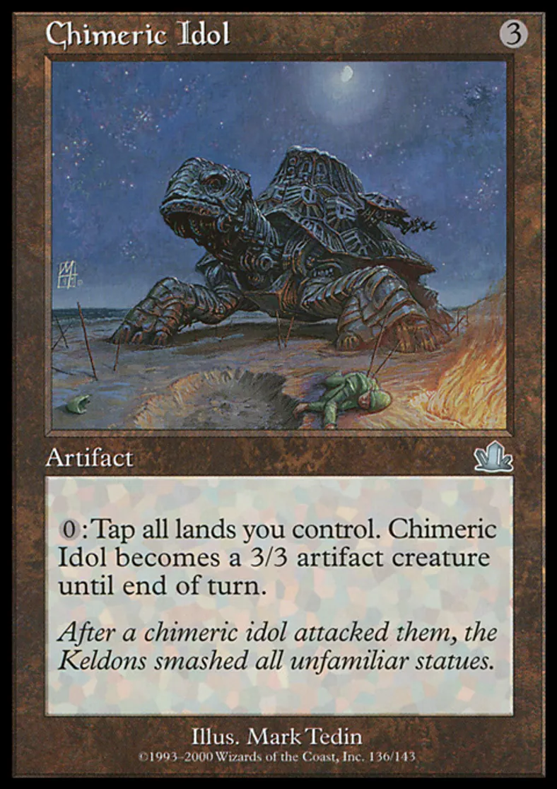 | Oracle Text | {{0}}: Tap all lands you control. Chimeric Idol becomes a 3/3 Turtle artifact creature until end of turn. | ||