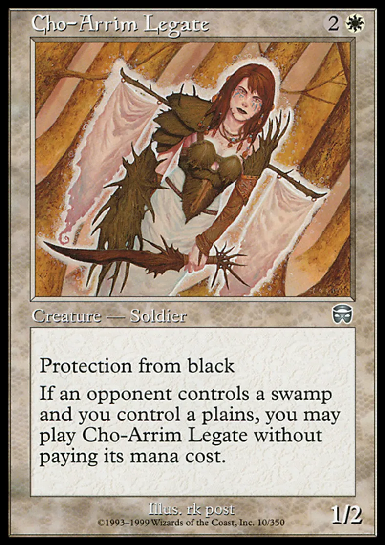| Oracle Text | Protection from black If an opponent controls a Swamp and you control a Plains, you may cast Cho-Arrim Legate without paying its mana cost. | ||