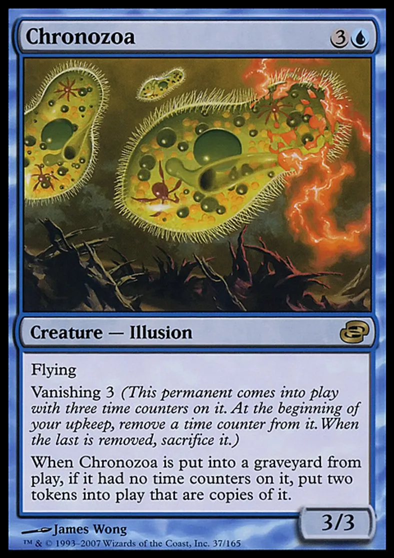 | Oracle Text | Flying Vanishing 3 (This permanent enters the battlefield with three time counters on it. At the beginning of your upkeep, remove a time counter from it. When the last is removed, sacrifice it.) When Chronozoa dies, if it had no time counters on it, put two tokens that are copies of it onto the battlefield. | ||