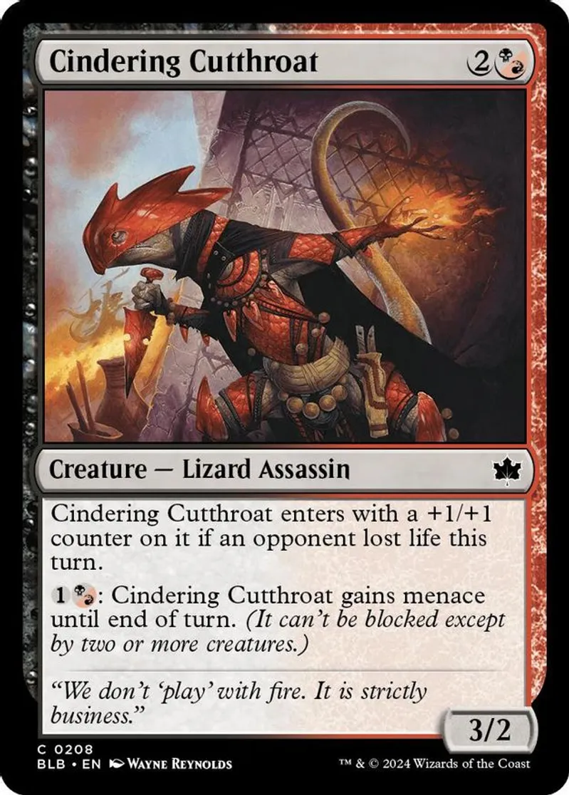 Magic: the Gathering (mtg) Common creature — lizard assassin Cindering Cutthroat from Bloomburrow (BLB) last updated 2026-02-21 15:23:32
