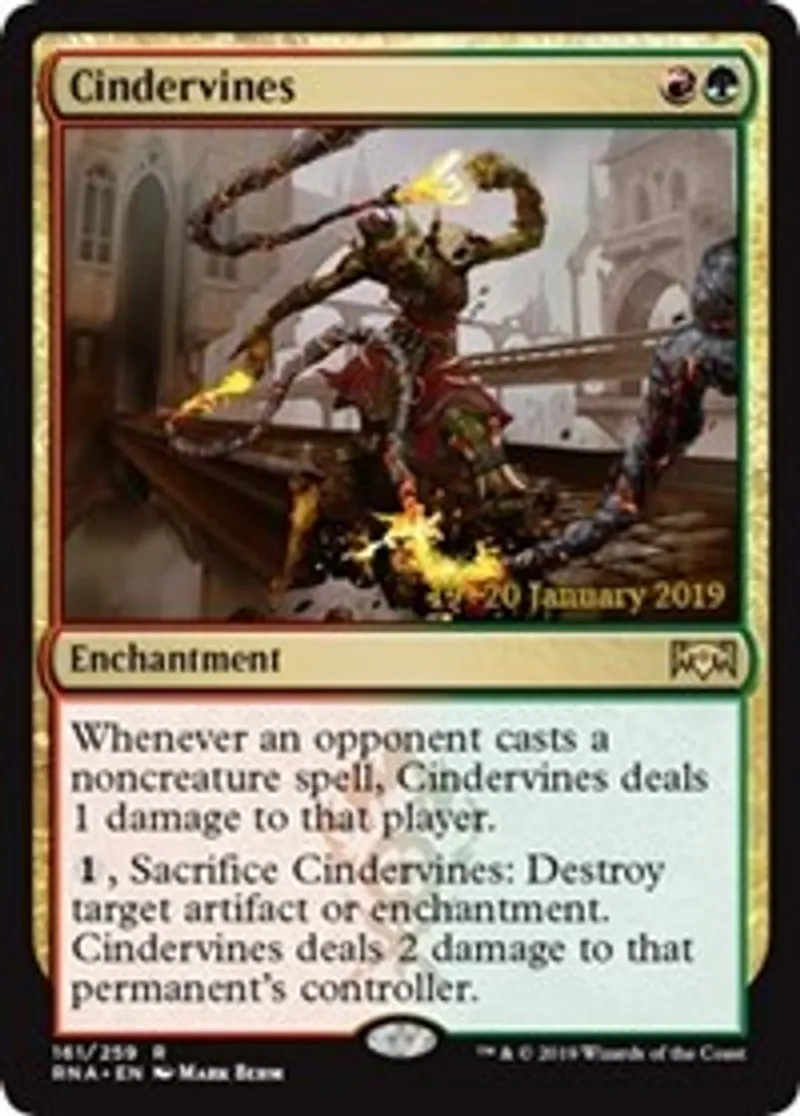 ({1}), Sacrifice Cindervines: Destroy target artifact or enchantment. Cindervines deals 2 damage to that permanent’s controller. | ||
