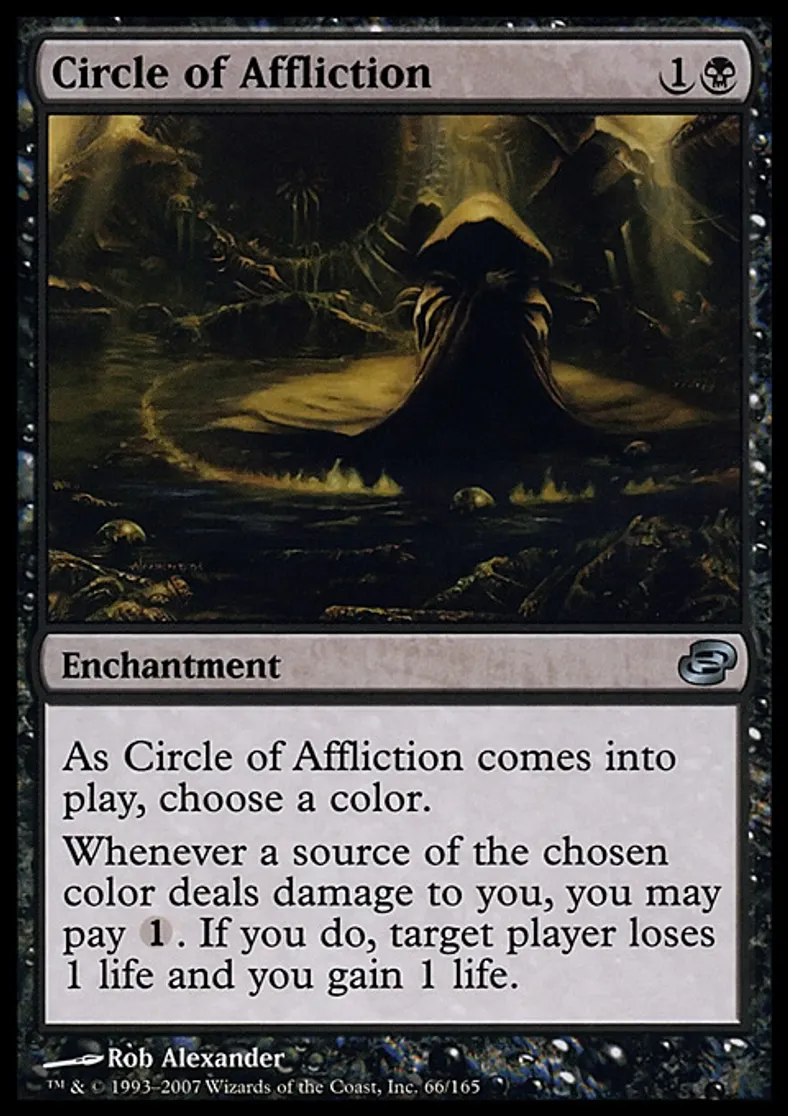 | Oracle Text | As Circle of Affliction enters the battlefield, choose a color. Whenever a source of the chosen color deals damage to you, you may pay {{1}}. If you do, target player loses 1 life and you gain 1 life. | ||