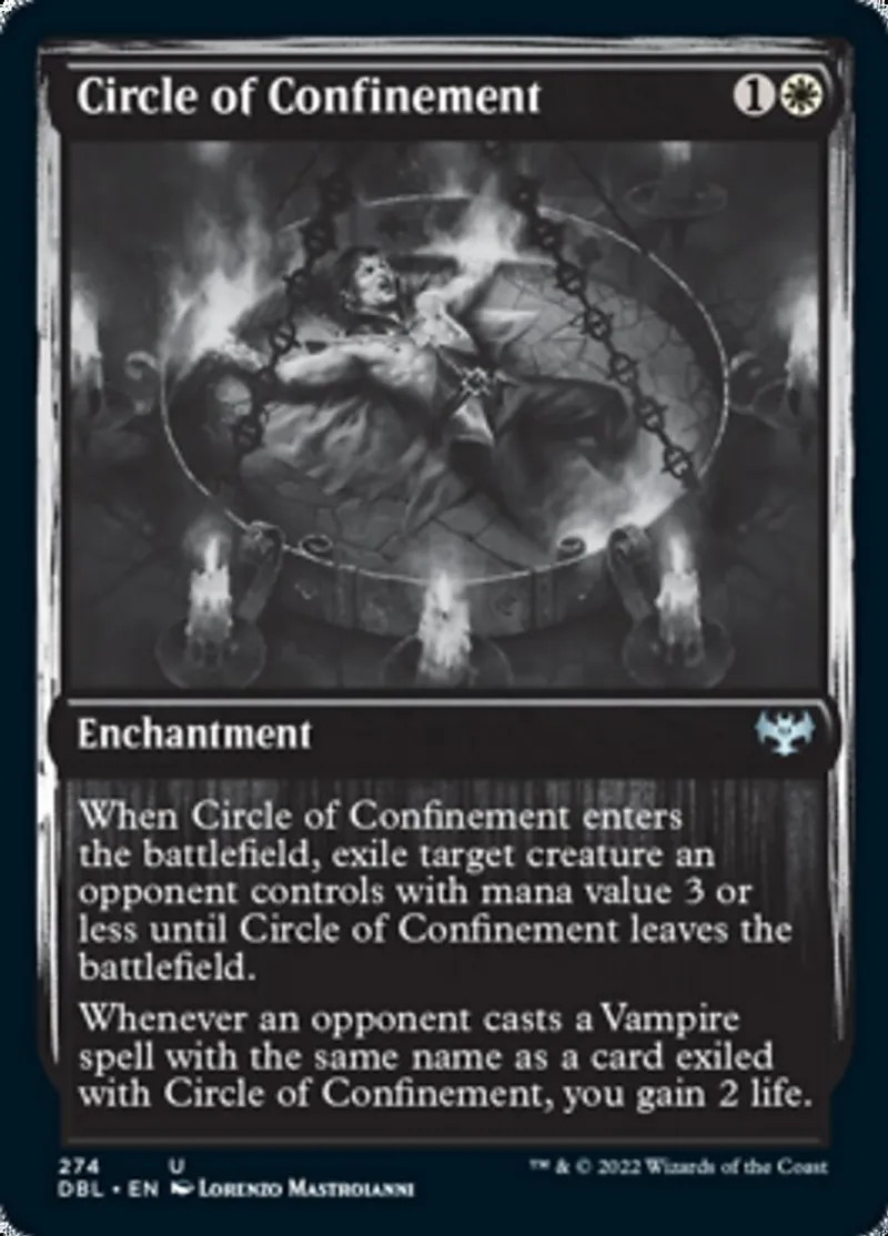 Whenever an opponent casts a Vampire spell with the same name as a card exiled with Circle of Confinement, you gain 2 life. | ||