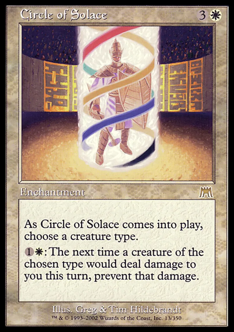 | Oracle Text | As Circle of Solace enters the battlefield, choose a creature type. {{1}}{{w}}: The next time a creature of the chosen type would deal damage to you this turn, prevent that damage. | ||