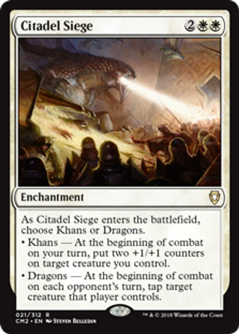 | Oracle Text | As Citadel Siege enters the battlefield, choose Khans or Dragons. • Khans — At the beginning of combat on your turn, put two +1/+1 counters on target creature you control. • Dragons — At the beginning of combat on each opponent's turn, tap target creature that player controls. | ||
