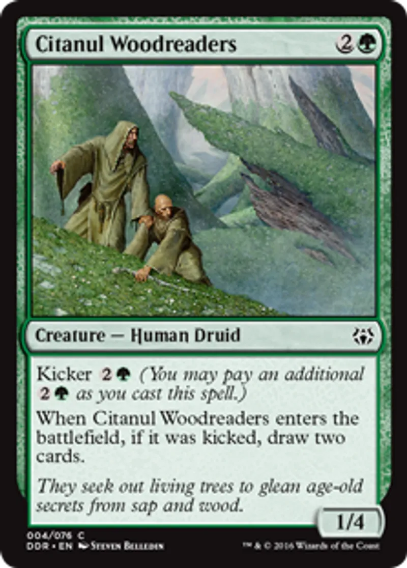 | Oracle Text | Kicker {{2}}{{g}} (You may pay an additional {{2}}{{g}} as you cast this spell.) When Citanul Woodreaders enters the battlefield, if it was kicked, draw two cards. | ||