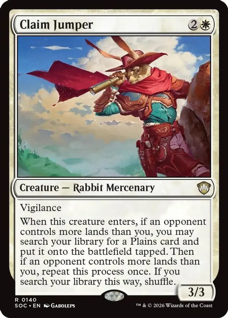 Magic: the Gathering (mtg) Rare creature — rabbit mercenary Claim Jumper from Commander: Secrets of Strixhaven (SOC) last updated 2026-04-17 00:18:40
