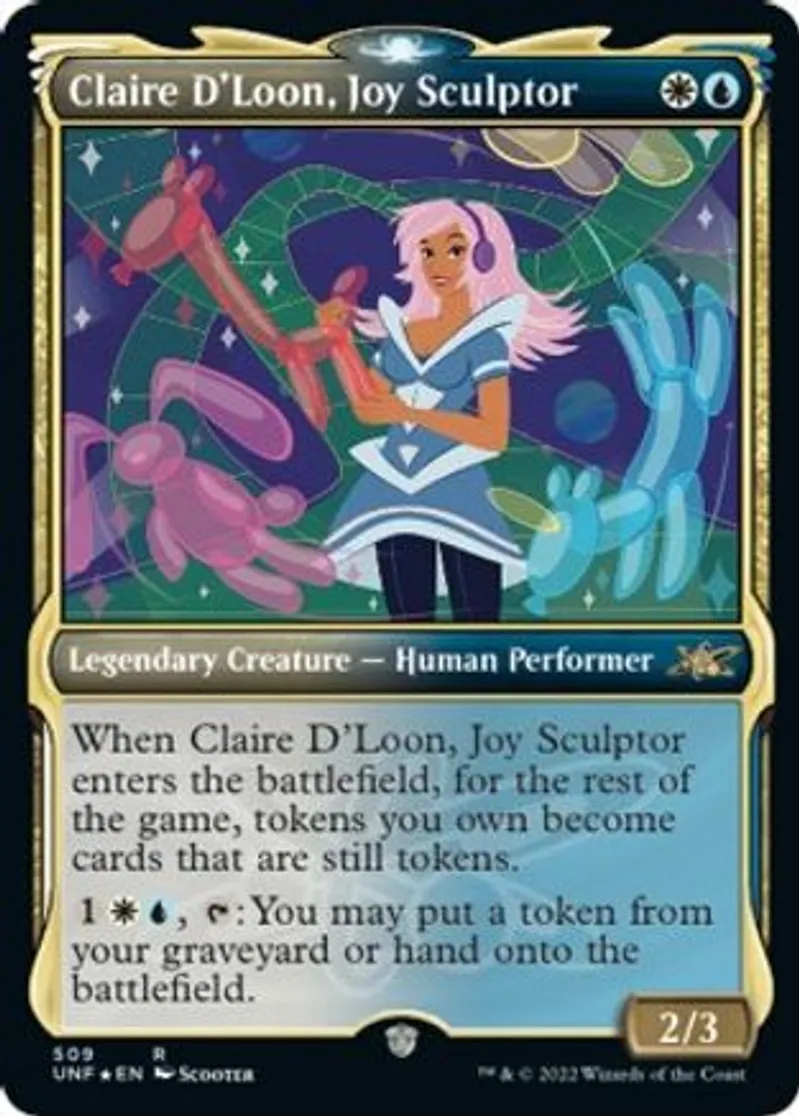 | Oracle Text | When Claire D'Loon, Joy Sculptor enters the battlefield, for the rest of the game, tokens you own become cards that are still tokens. (They continue to exist after they leave the battlefield.)