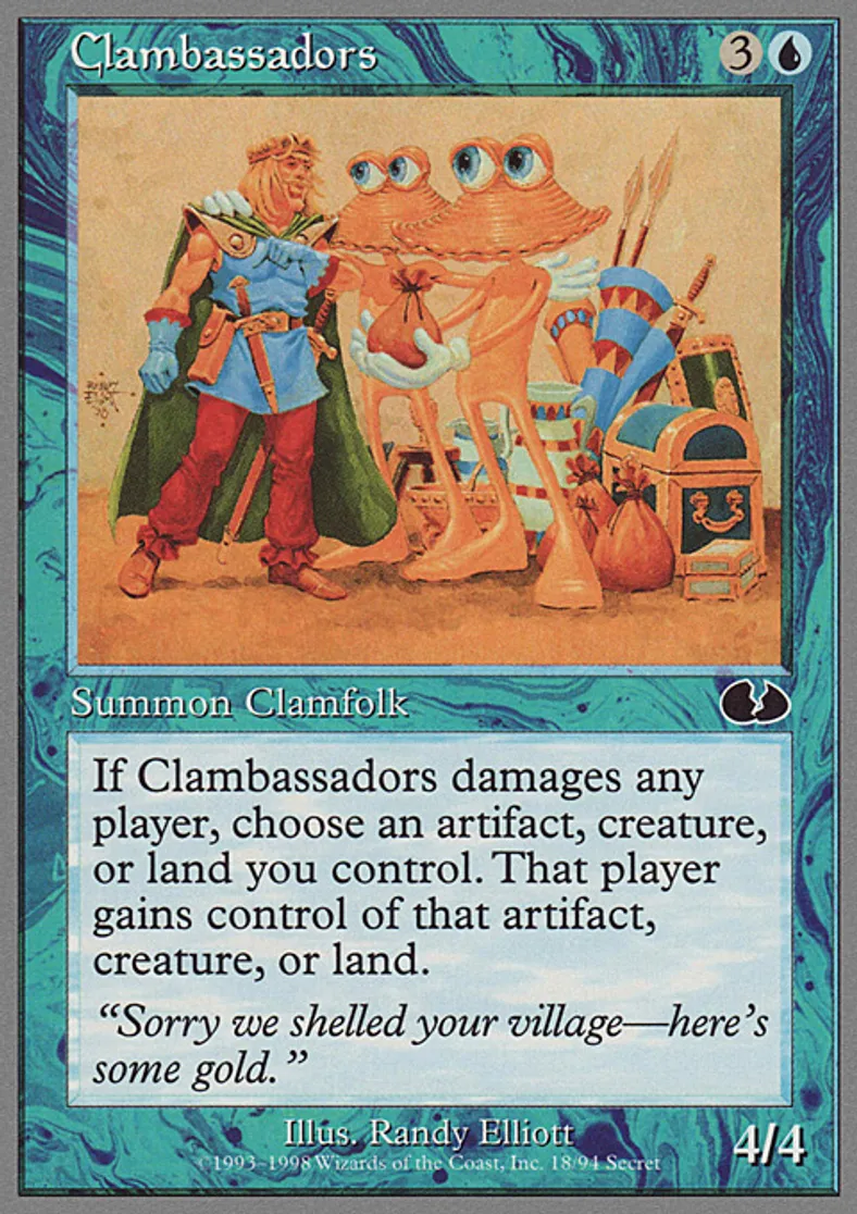 | Oracle Text | If Clambassadors damages any player, choose an artifact, creature, or land you control. That player gains control of that artifact, creature, or land. | ||