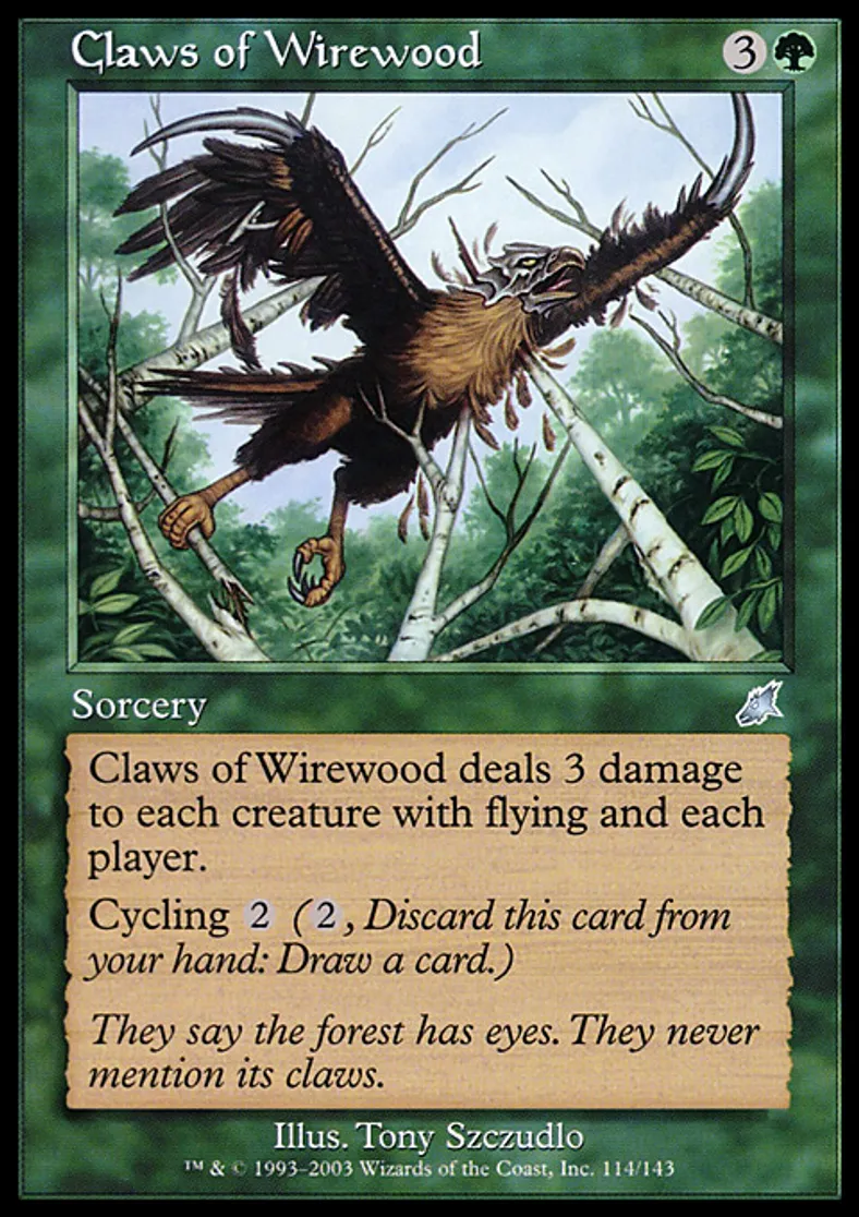 | Oracle Text | Claws of Wirewood deals 3 damage to each creature with flying and each player. Cycling {{2}} ({{2}}, Discard this card: Draw a card.) | ||
