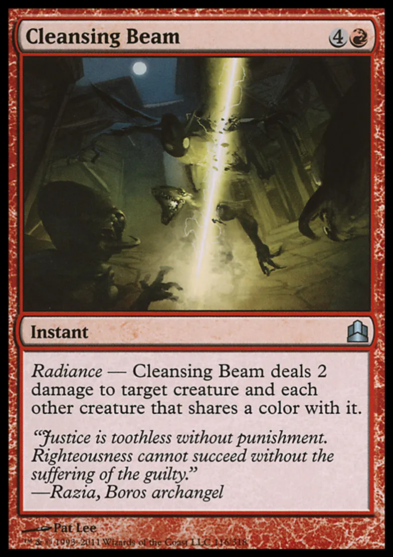 | Oracle Text | Radiance — Cleansing Beam deals 2 damage to target creature and each other creature that shares a color with it. | ||
