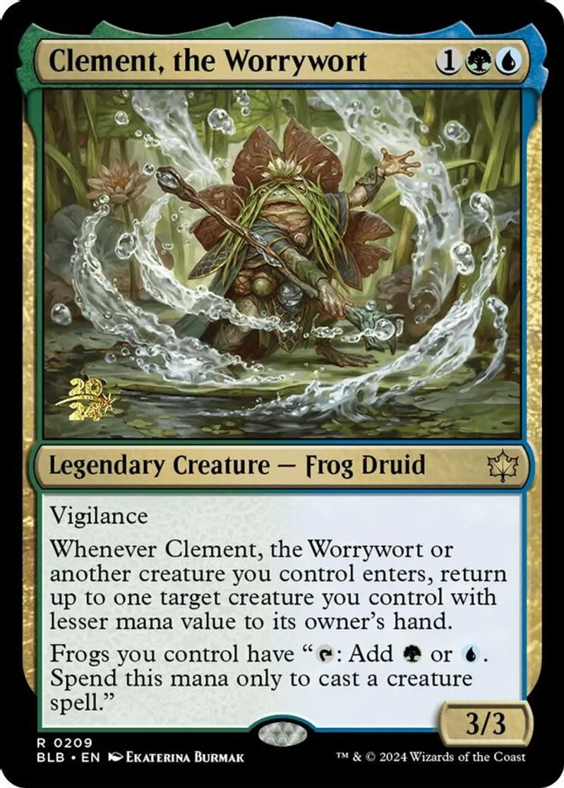 whenever clement, the worrywort or another creature you control enters, return up to one target creature you control with lesser mana value to its owner's hand. frogs you control have "t: add g or u. spend this mana only to cast a creature spell." | ||