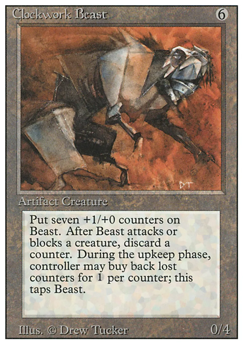 | Oracle Text | Clockwork Beast enters the battlefield with seven +1/+0 counters on it. At end of combat, if Clockwork Beast attacked or blocked this combat, remove a +1/+0 counter from it. {{x}}, {{t}}: Put up to X +1/+0 counters on Clockwork Beast. This ability can't cause the total number of +1/+0 counters on Clockwork Beast to be greater than seven. Activate this ability only during your upkeep. | ||