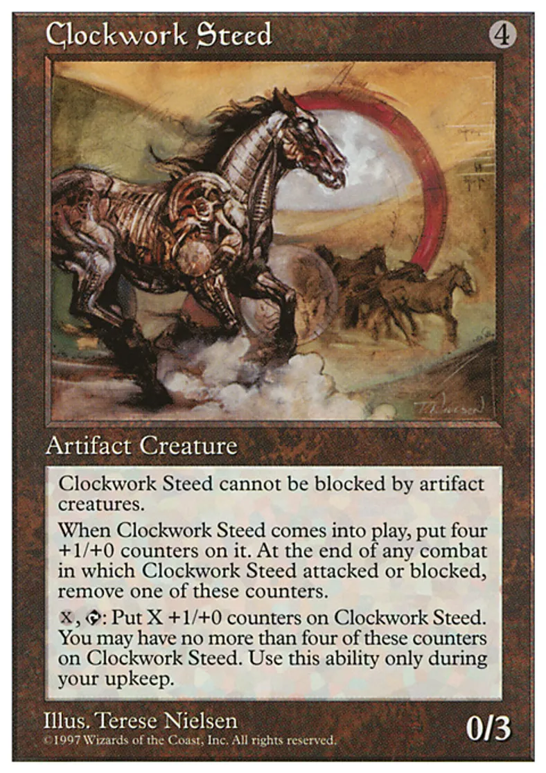 | Oracle Text | Clockwork Steed enters the battlefield with four +1/+0 counters on it. Clockwork Steed can't be blocked by artifact creatures. At end of combat, if Clockwork Steed attacked or blocked this combat, remove a +1/+0 counter from it. {{x}}, {{t}}: Put up to X +1/+0 counters on Clockwork Steed. This ability can't cause the total number of +1/+0 counters on Clockwork Steed to be greater than four. Activate this ability only during your upkeep. | ||