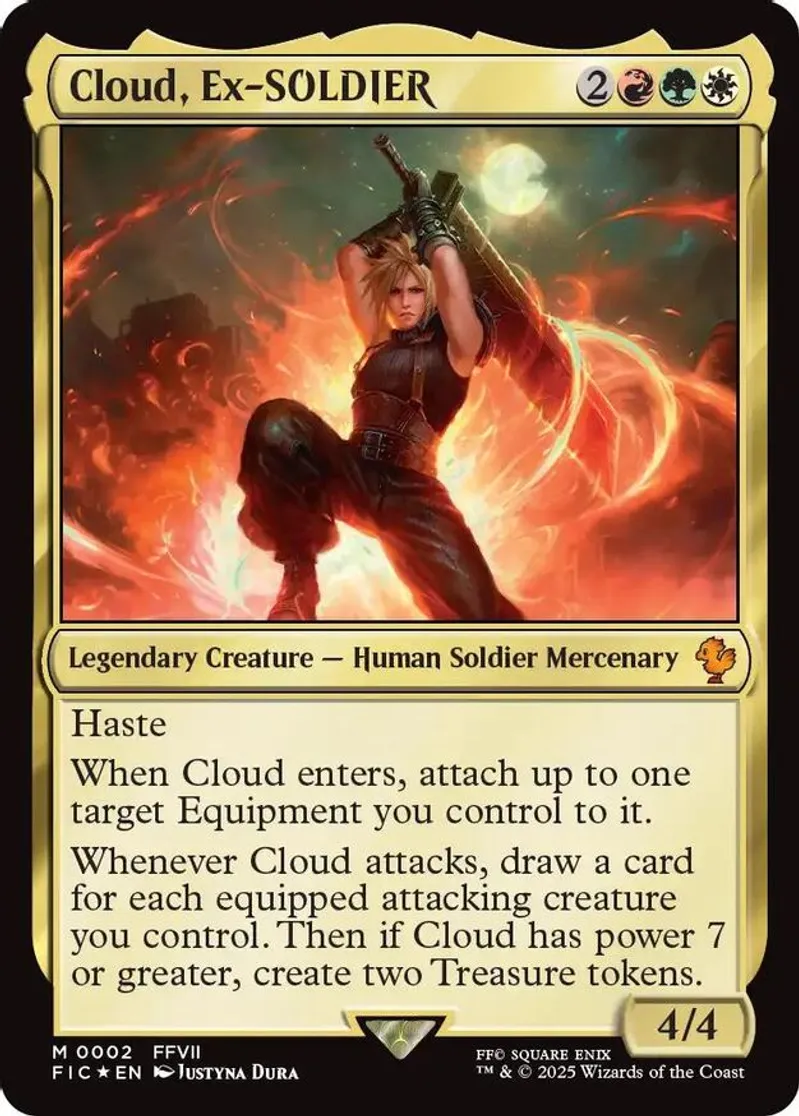| Oracle Text | haste when cloud enters, attach up to one target equipment you control to it. whenever cloud attacks, draw a card for each equipped attacking creature you control. then if cloud has power 7 or greater, create two treasure tokens. | ||