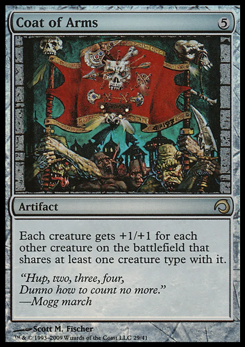 | Oracle Text | Each creature gets +1/+1 for each other creature on the battlefield that shares at least one creature type with it. (For example, if two Goblin Warriors and a Goblin Shaman are on the battlefield, each gets +2/+2.) | ||