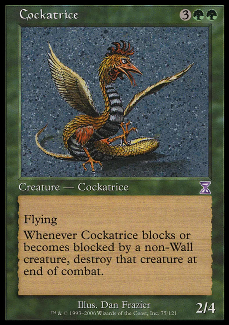 | Oracle Text | Flying Whenever Cockatrice blocks or becomes blocked by a non-Wall creature, destroy that creature at end of combat. | ||