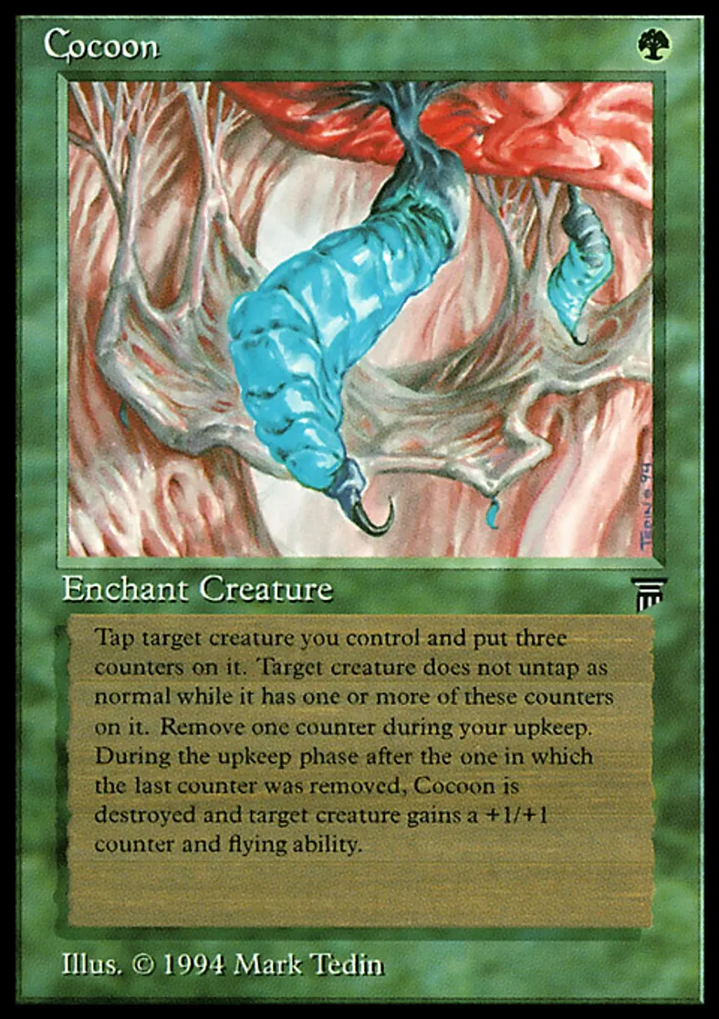 | Oracle Text | Enchant creature you control Enchanted creature doesn't untap during your untap step if Cocoon has a pupa counter on it. When Cocoon enters the battlefield, tap enchanted creature and put three pupa counters on Cocoon. At the beginning of your upkeep, remove a pupa counter from Cocoon. If you can't, sacrifice it, put a +1/+1 counter on enchanted creature, and that creature gains flying. (This effect lasts indefinitely.) | ||