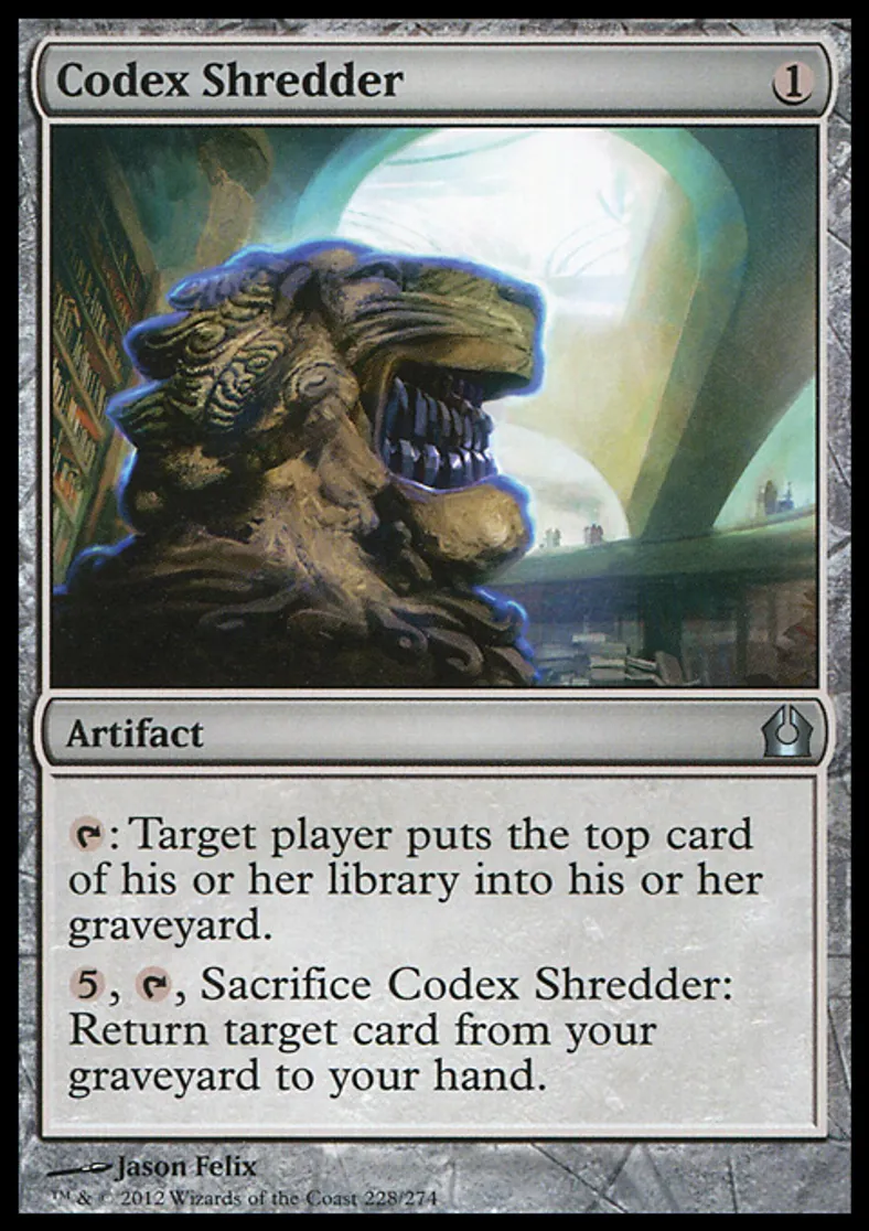 | Oracle Text | {{t}}: Target player puts the top card of his or her library into his or her graveyard. {{5}}, {{t}}, Sacrifice Codex Shredder: Return target card from your graveyard to your hand. | ||