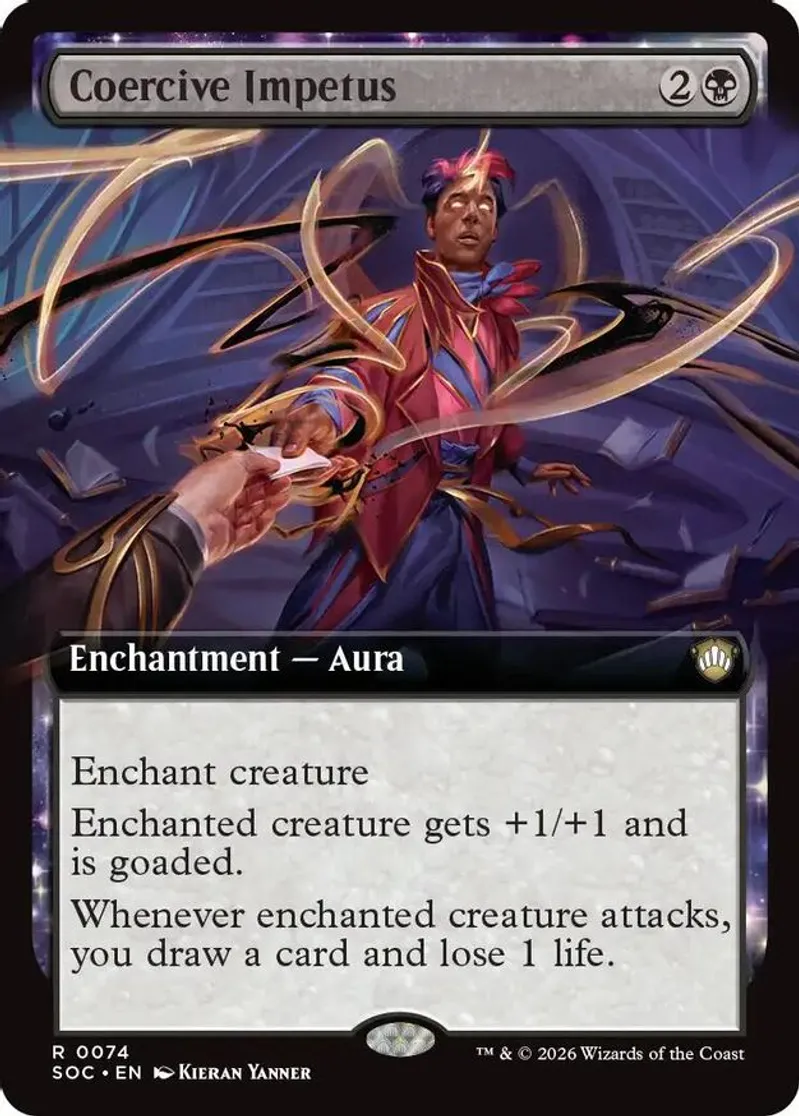 Coercive Impetus (Extended Art) is a Rare in the set Commander: Secrets of Strixhaven.