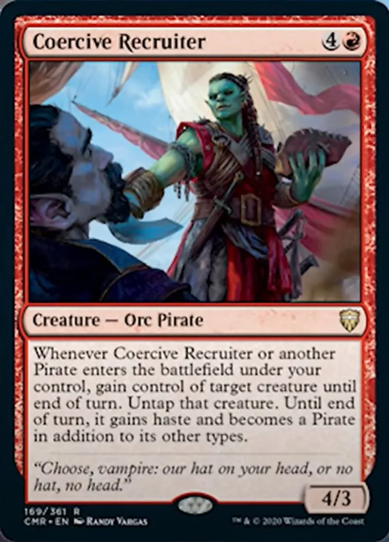 | Oracle Text | Whenever Coercive Recruiter or another Pirate enters the battlefield under your control, gain control of target creature until end of turn. Untap that creature. Until end of turn, it gains haste and becomes a Pirate in addition to its other types. | ||